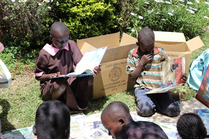 Left..."Children in the Philippines celebrating the arrival of books from the WBFN Book Project" Right: children in Kenya receiving schoolbooks