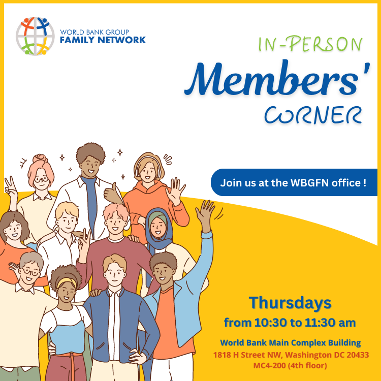 We invite you to join us in-person at our WBG Family Network office for an hour, twice a monthly on Thursdays from 10:30am - 11:30am, for an informal social setting, to support you, our member.