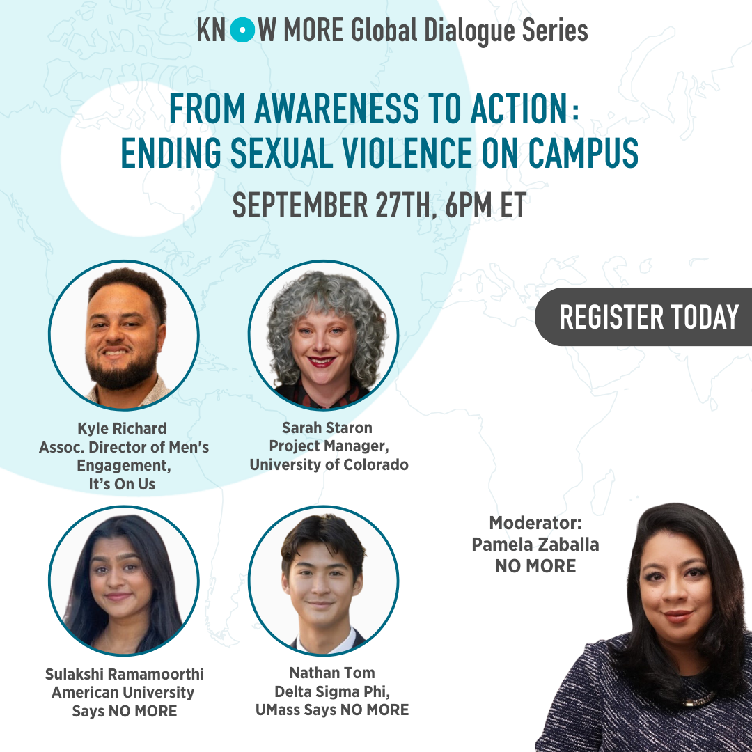 Please join us on Wednesday, September 27th, at 6pm ET, for a very special KNOW MORE Global Dialogue: “From Awareness to Action: Ending Sexual Violence on Campus.”