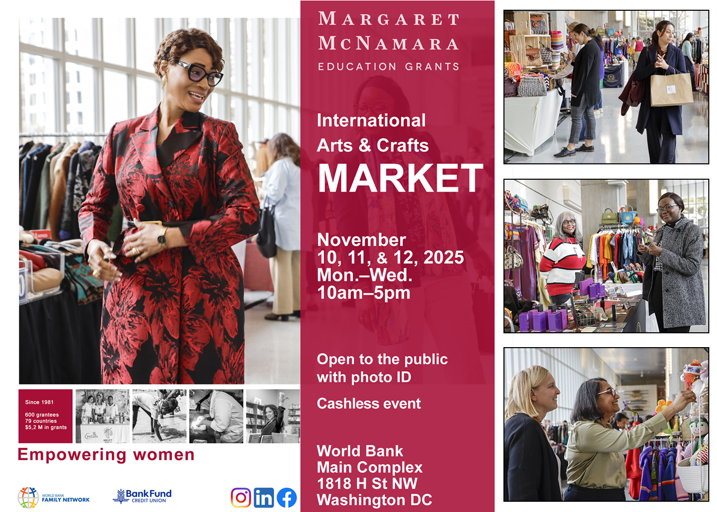 Three days of fantastic shopping right here at the World Bank HQ lobby, Nov. 10, 11, and 12-  10 am to 5 pm.