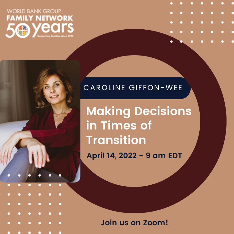 Join Caroline Giffon, Founder of Girafe Coaching, Certified Life Coach for Expatriates' partners, and Host of Love Your Expat Life Podcast in her upcoming roundtable: Making Decisions In Times of Transition on April 14, 9 am EST.