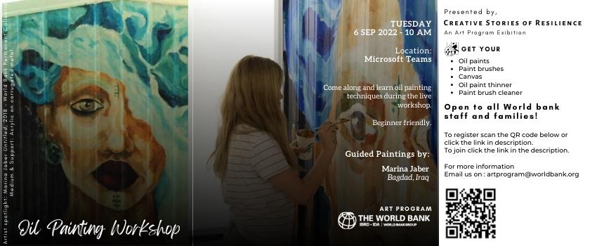 Gather your art materials to join a live art workshop where artist Marina Jaber, from Baghdad, Iraq will walk you through various oil painting techniques.